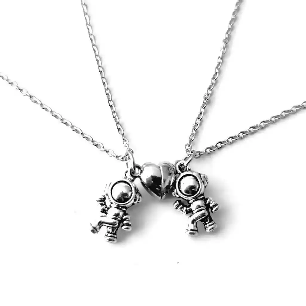 Los hermosos accesorios en particular los collares de pareja Astronauta marcan tendencia en la actualidad con diseños exclusivos, modernos juveniles que podrás lucir y combinar con cualquier look luciendo bella todos los días. Ofreciendo una amplia gama de productos para todos los gustos, siéntete segura de comprar con nosotros los productos son idénticos a las fotografías. _ **//// El juego incluye estuche /// Nota: Se vende el par. FICHA TÉCNICA Material de la cadena: Acero Inoxidable Longitud de la cadena: 50 cm Material del dije: Metal Dimensiones dije de astronauta (Alto x Ancho) : 1.8 cm x 1.2 cm Dimensión mitad de corazón (Alto x Ancho): 1 cm x 0.7 cm \*Términos de garantía:\ Para defectos de fábrica o retractos: Por favor revise el producto apenas lo reciba y antes de usarlo. No aplican ley de retracto o defectos de fábrica luego de usar el producto. Se manejan máximo 5 días para reportar defectos de fábrica (por ejemplo, producto funciona mal, piezas faltantes, rotas, etc). Para hacer efectiva la devolución el producto debe devolverse con el empaque original, el cual debe estar en buen estado, incluir todos los documentos y las partes completas y sin daños. Los cuidados y recomendaciones para mantener un producto en buen estado son los siguientes: No aplicarle perfumes ni cremas directamente, no mojarlos, no dejarlos caer y procurar limpiarlos para retirar suciedad.