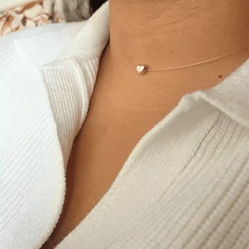Un accesorio que enaltece el amor puro, que no necesita adornos sino que se manifiesta en lo simple y verdadero. Descripción del producto: Un collar estilo gargantilla con hilo transparente y dije de corazón dorado de acero inoxidable.