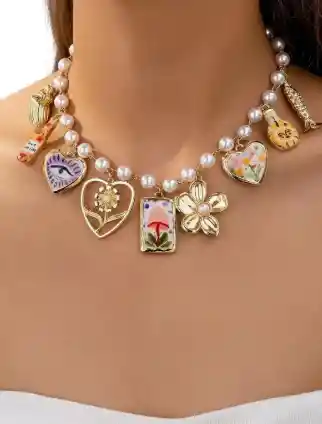 Collar de Perlas con Dijes Artísticos Este collar combina perlas blancas con una selección única de dijes esmaltados y dorados, cada uno con un diseño simbólico y lleno de personalidad: ❤️ Corazones con flores y ojos místicos 🌶️ Chile rojo y amarillo vibrante ☂️ Paraguas con detalles florales 🎶 Instrumento musical en miniatura 🐟 Pez dorado texturizado 🌸 Flores en relieve Perfecto para quienes aman los detalles únicos y quieren llevar arte en cada look 🎨💫
