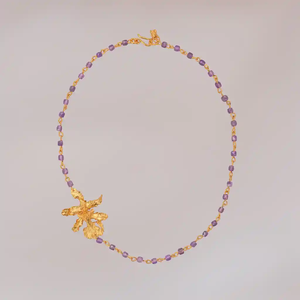Este collar une la energía protectora del Cuarzo Amatista con la delicadeza exótica de una Orquídea Chocolate real, inmortalizada bajo un baño de oro. La flor conserva su textura original, creando un contraste fascinante con el brillo violeta de la piedra natural. Es una pieza cargada de simbolismo y elegancia, ideal para aportar un toque de color y sofisticación orgánica a tu día a día o para regalar una joya con significado profundo. Nota: La naturaleza artesanal de este collar garantiza que cada flor y cada piedra sean únicas en su forma y tonalidad.