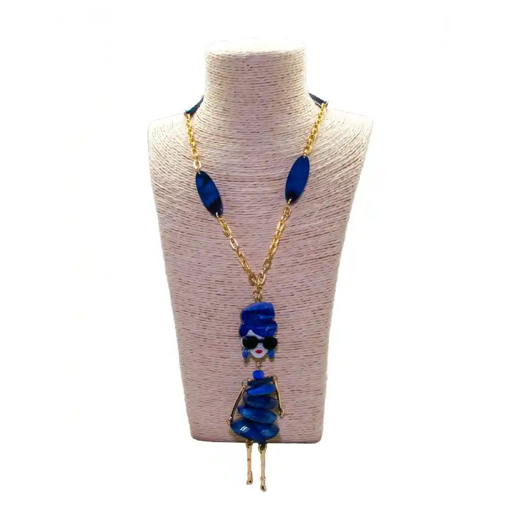 Descubre la audacia con el Collar Dama Azul de Bohemia. Su diseño único, que combina un dije en forma de muñeca con un collar de eslabones dorados y óvalos azules, le da un toque sofisticado y moderno a cualquier atuendo. Es el accesorio perfecto para un look único y chic que te hará destacar en cualquier ocasión.