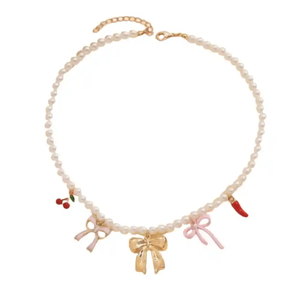 Este hermoso collar combina la elegancia de las perlas con dijes delicados que aportan un toque tierno y moderno. Una pieza ideal para mujeres que aman los accesorios sutiles pero con personalidad. ✨ Características del diseño: ✔️Cadena de perlas sintéticas brillantes y de alta calidad. ✔️Dijes decorativos: cerecitas, lazos rosados, lazo dorado y dije rojo tipo amuleto. ✔️Estilo dulce, juvenil y femenino. ✔️Cierre ajustable en tono dorado para un fit perfecto. ✔️Ligero, cómodo y fácil de combinar con cualquier look. Ideal para: ✔ Regalos ✔ Looks casuales o románticos ✔ Sesiones de fotos ✔ Complementar outfits delicados