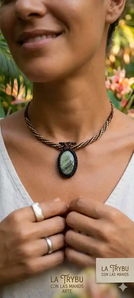 Eleva tu estilo con una pieza única que fusiona el arte ancestral del tejido con la fuerza de la naturaleza. Este collar ha sido elaborado totalmente a mano mediante la técnica de macramé, utilizando hilos de alta resistencia que garantizan durabilidad y comodidad. ​El protagonista es un dije de Piedra Natural tallada (Obsidiana), seleccionada por su brillo profundo y sus vetas naturales únicas. Su diseño ergonómico y ajustable lo hace ideal tanto para hombres como para mujeres que buscan un accesorio con carácter y elegancia orgánica. ​ ■​Material: Piedra natural auténtica y tallada. ■​Técnica: Tejido artesanal en macramé de alta precisión. ■​Ajuste: Sistema de cierre corredizo para adaptar el largo a tu preferencia. ■​Origen: Producto 100% artesanal colombiano.