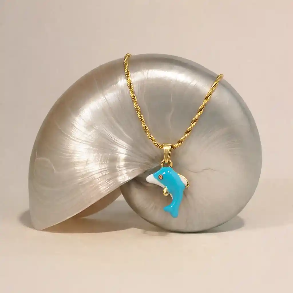 Collar con dije de corazon color azul forma de delfin , cadena de 40 cm , color dorado , Material Cover gold