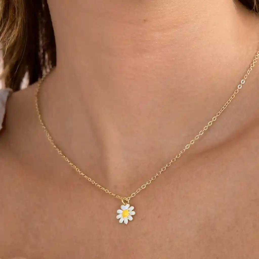 Delicada y femenina, esta cadena elaborada a mano es mucho más que un accesorio: es un símbolo de renacer, inspiración y empoderamiento. El dije de margarita, con su brillo dorado, transmite amor y significado en cada detalle, convirtiéndose en el regalo perfecto para mujeres que valoran la elegancia y la autenticidad. Características: - Dije en forma de flor margarita con baño de oro - Cadena con baño de oro, resistente y brillante - Herrajes con baño de oro para mayor durabilidad - Largo: 40 cm + 5 cm de extensor para un ajuste ideal Ideal para: - Regalar en ocasiones especiales (cumpleaños, aniversarios, detalles románticos) - Llevar como recordatorio personal de fuerza y resiliencia - Complementar cualquier look con un toque delicado y significativo