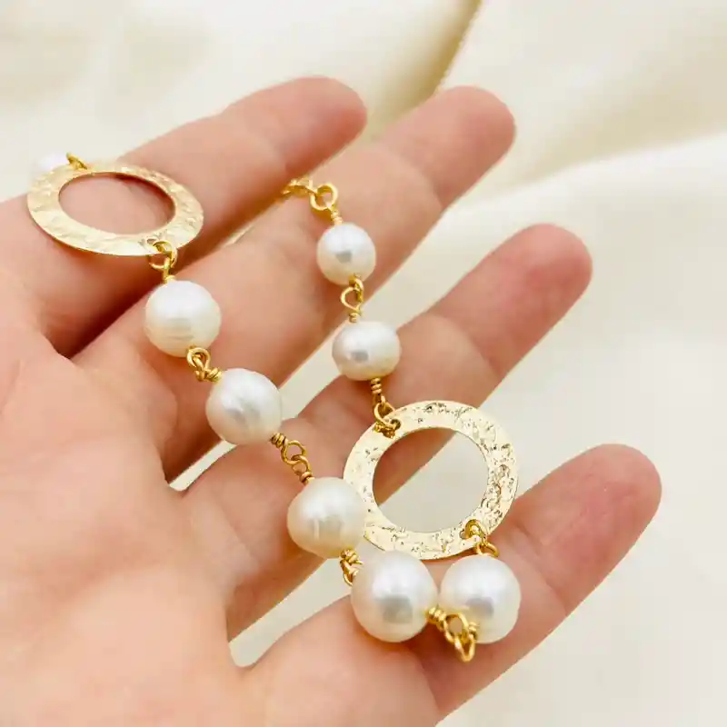 Collar con Perlas naturales corto, diseño Caroco. El collar esta fabricado con perlas blancas y argollas gruesas con textura martillada, terminado con cadena dorada y un broche langosta. El collar mide 47cm. de largo total, se puede ajustar mas corto con la cadena.