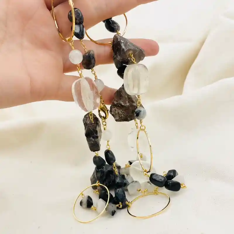 Collar Caroco largo, con piedras naturales: Cuarzo rutilado y Obsidiana en bruto, intercalados con argollas doradas grandes. Collar versátil, el collar abierto mide 1mt. de largo total, permitiendo jugar con diferentes formas de usarlo.