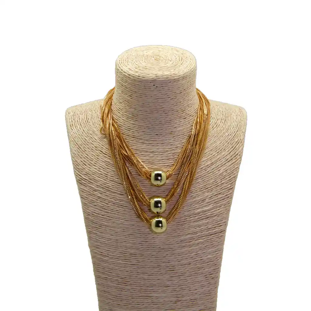 Descubre el encanto audaz del Collar "Dunas Doradas". Su diseño, con múltiples hileras de cadenas que se juntan en tres esferas, evoca la elegancia y el brillo del desierto. Es el accesorio perfecto para un look único y chic que te hará destacar en cualquier ocasión.