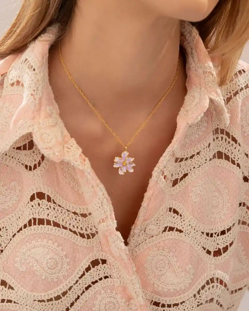 Collar con cadena tipo espiga pequeña y dije con argolla en forma de flor, elaborado con aleación de metales y baño de oro o plata, finalizado con laca de alta resistencia. Hecho en Medellín, Colombia. Cuenta con un dije de 31 mm que aporta protagonismo al diseño y una cadena de 40 cm con extensión de 8 cm que permite regular el largo según preferencia. Incluye broche tipo pico de loro para un ajuste cómodo y seguro. NO INCLUYE ARETES. Ten presente que algunas de las fotos de apoyo incluyen otros productos que se venden por separado. Nuestros collares individuales son ideales para usarlos solos o combinar entre si y crear un layering único.