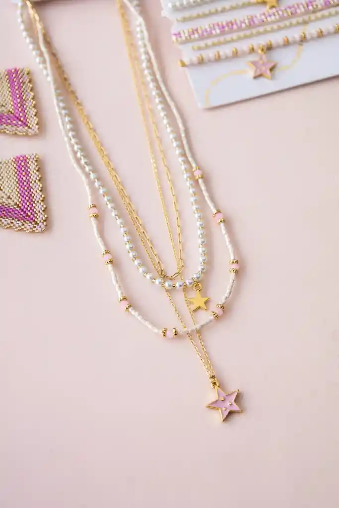 Set de cadena en Oro Goldfilled Brasilero con baño en oro de 24k elaborado en Miyuki japonés, balines y perlas. Incluye aretes tipo topos (aretes pequeños), el diseño del arete te llegará según disponibilidad. Incluye: 1 set de cadenas, se pueden usar juntas o por separado. Recibe con tu compra una FLORIBAG gratis, para que guardes por separado tus accesorios. Hecho a mano en Colombia. *Ten presente que algunas de las imágenes pueden estar ambientadas con otros productos que se venden por separado.