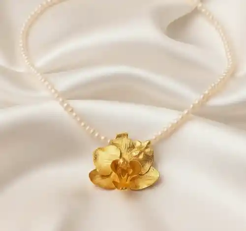 El Collar Perlas Orquidea Phalaenopsis es una pieza que une la delicadeza de la naturaleza con la elegancia atemporal de la joyería artesanal. La orquídea Phalaenopsis, conocida como “la mariposa” por la forma de sus pétalos, simboliza belleza, feminidad y abundancia. Inmortalizada mediante fundición orgánica artesanal, esta flor conserva su forma auténtica y se combina con el brillo sutil de las perlas naturales, creando un contraste sofisticado y equilibrado. Su diseño está pensado para resaltar en ocasiones especiales, convirtiéndose en el centro de atención de cualquier atuendo. Cada collar es único, hecho a mano en Colombia, y transmite la esencia de la naturaleza convertida en arte perdurable. Una joya ideal para quienes buscan elegancia con un trasfondo simbólico.