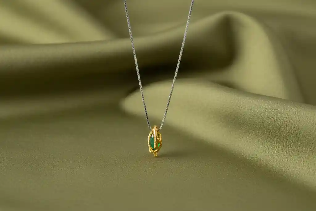 Este collar inmortaliza una ramita real bajo un baño de oro, conservando cada relieve y nudo de la madera original. El diseño se eleva con una esmeralda genuina que aporta un destello de color vibrante, suspendida delicadamente de una cadena de plata para un contraste de metales moderno y elegante. Es la pieza perfecta para quienes buscan un amuleto de naturaleza diaria: sutil para la oficina, pero con el carácter suficiente para destacar en una ocasión especial. Un diseño que celebra la imperfección perfecta de la botánica. Nota: La naturaleza artesanal de este collar garantiza que cada par sea único en su forma y detalle.
