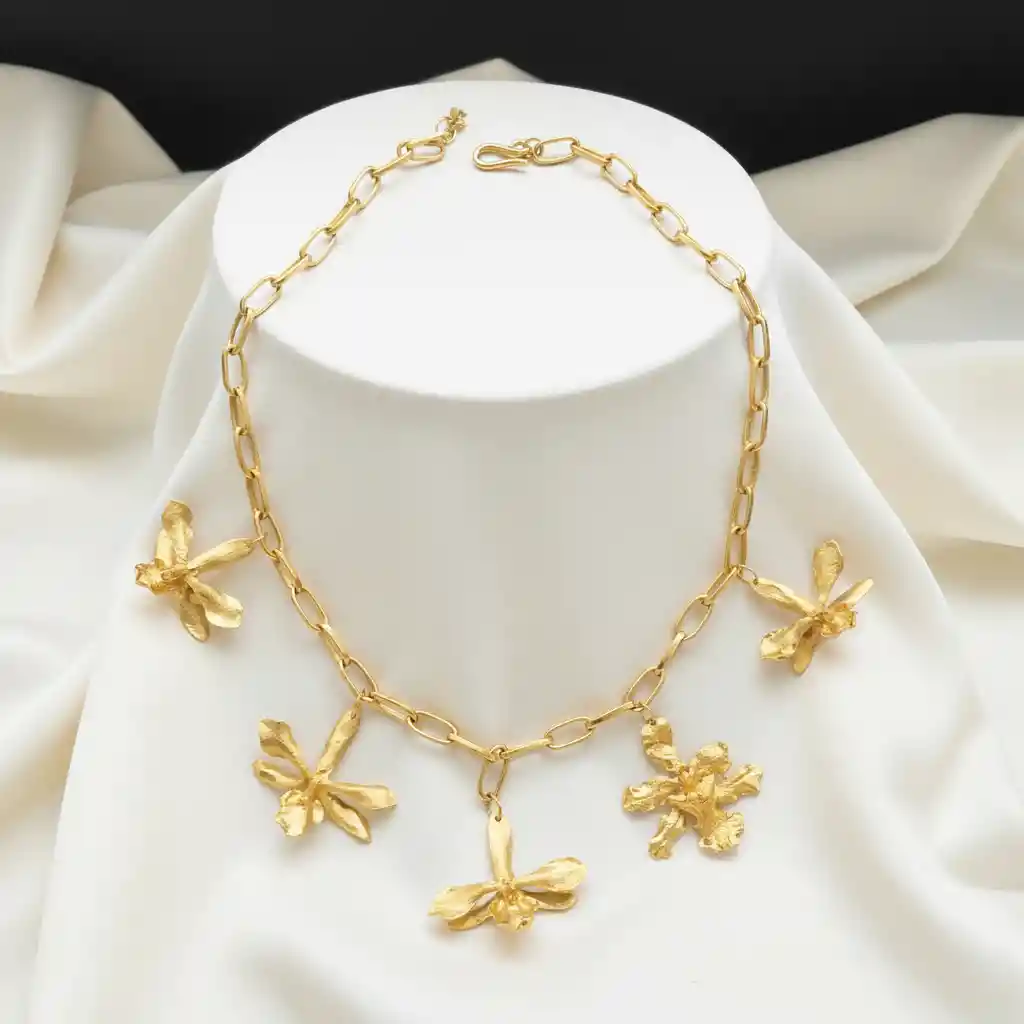 Esta joya nace de la belleza real de una orquídea Prosthechea Sceptra, una especie poco común reconocida por su forma elegante y su simetría perfecta. Su nombre, que significa “cetro”, evoca la autoridad suave, la nobleza del espíritu y el poder silencioso de la naturaleza. Cada flor de este collar fue inspirada directamente en esa armonía orgánica, transformando su delicadeza en una pieza de arte dorada. Su acabado artesanal resalta la textura viva de los pétalos, logrando un equilibrio entre fuerza y sutileza.