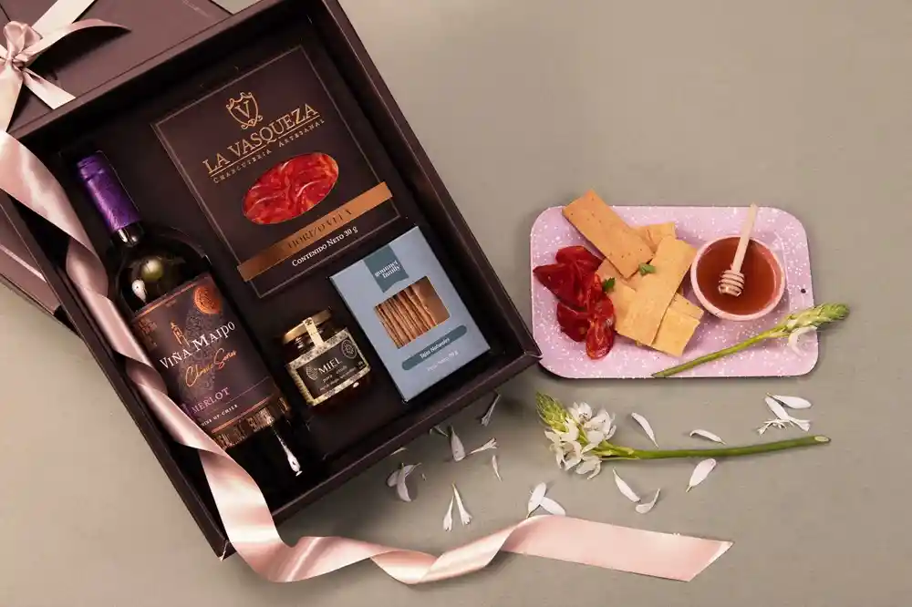Botella de vino (750 ml) acompañada de Tejas naturales para untar (90 g) con una miel artesanal (130 ml) y unas carnes maduras (30 g).