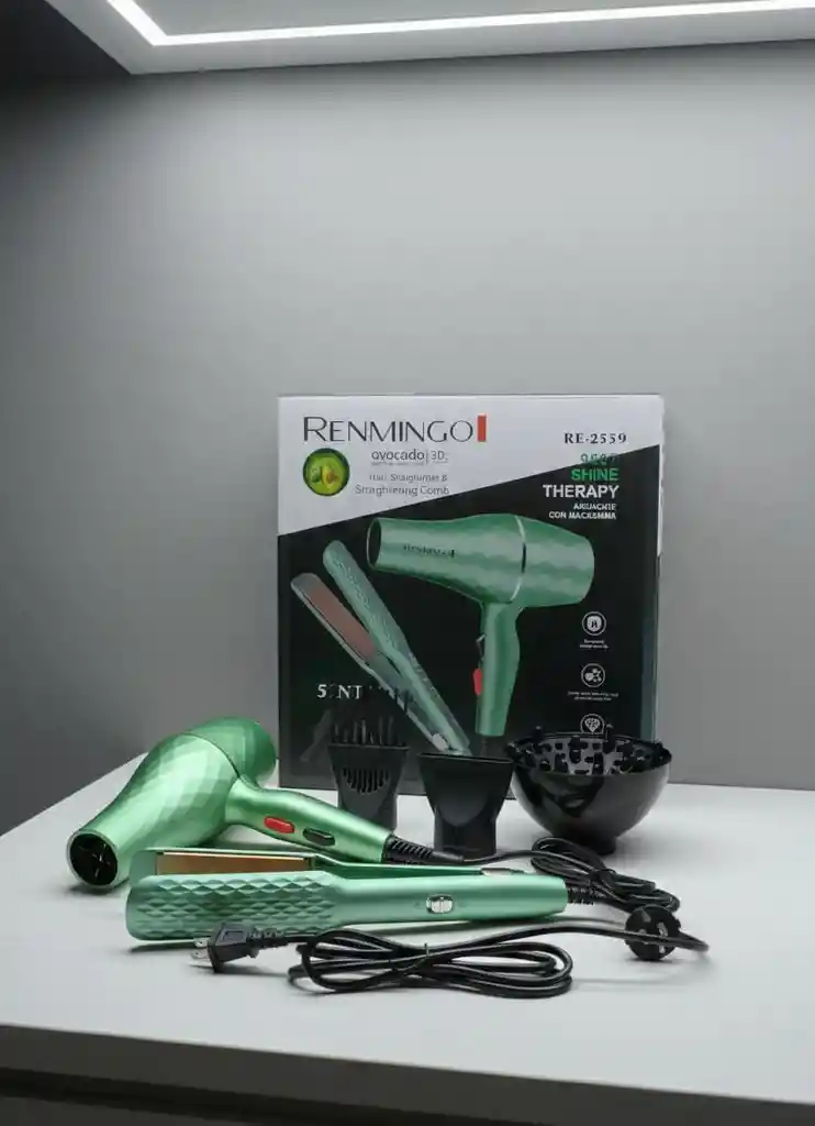 Set completo de estilismo profesional diseñado para secar, alisar y peinar el cabello, brindando un acabado brillante y sedoso gracias a su tecnología de aguacate y macadamia. • CARACTERÍSTICAS: • Tecnología Shine Therapy: Placas e interior con revestimiento cerámico enriquecido con aceite de aguacate y macadamia para mayor brillo. • Secador Potente: Motor de alto rendimiento con boquilla concentradora y difusor para definir rizos. • Plancha Alisadora: Diseño ergonómico con placas flotantes que se deslizan suavemente sin maltratar la fibra capilar. • Versatilidad 5 en 1: Incluye secador, plancha, difusor, boquilla y peine. • Control de Temperatura: Ajustes personalizables para diferentes tipos de cabello, desde fino hasta grueso.