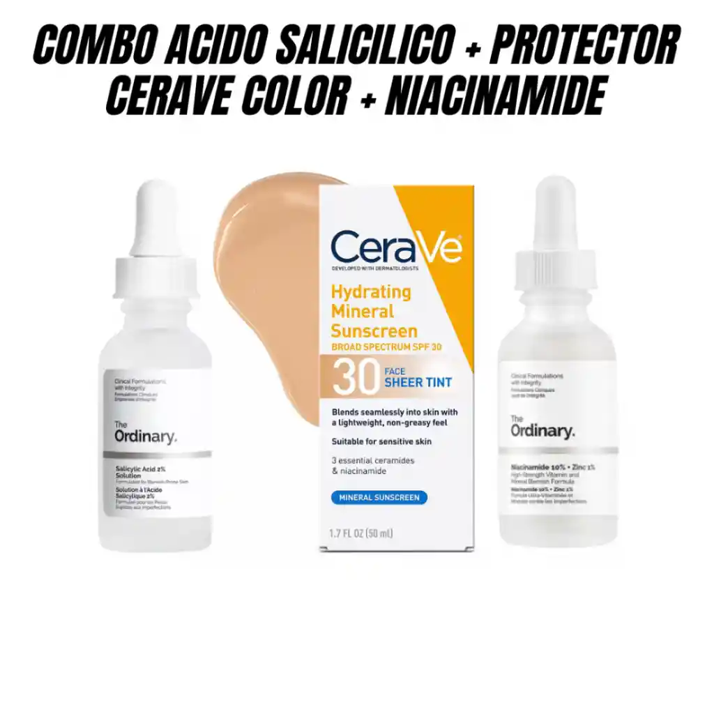 Combo Ácido Salicílico 2% 30 ml + Protector Solar CeraVe Hidratante Mineral Color 30 SPF 50 ml + Niacinamide 10% 30 ml: Ácido Salicílico 2%: Será tu aliado imprescindible para luchar contra esos granitos persistentes y prevenir su aparición, ya que calma y reduce visiblemente la inflamación y rojeces, así como descongestiona la piel. Además, gracias a su efecto exfoliante, te desharás de las células muertas, renovando y limpiando tu piel, dejándola lisa y luminosa. Protector solar CeraVe Hidratante Mineral Color 30 SPF: Protector solar para rostro con color adecuado para cualquier tono de piel. Ligero sin sensación grasosa. Formulado con Niacinamida para calmar la piel y Acido Hialuronico para mantenerla hidratada. SPF 30. Adecuado para todo tipo de piel, incluyendo piel seca, piel sensible, piel grasa y propensa al acné. Niacinamide 10%: Es un potente sérum con Vitamina B3 con el que ganarás tu lucha contra el acné. Con él, combatirás de raíz los síntomas más comunes previniendo los brotes acnéicos, controlando la grasa de la piel, minimizando los poros, cicatrizando marcas, unificando el tono de la piel, mejorando la textura y regulando la producción del sebo.