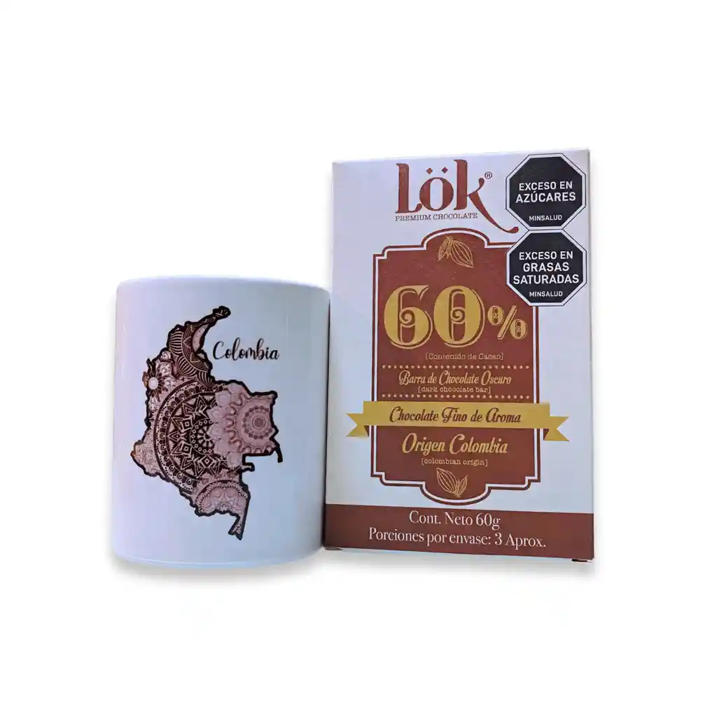 Combo Colombia 60% | Taza Mandalas 11 oz + Chocolate Lök 60% Cacao 60 g | Listo para regalar Descripción del producto El Combo Colombia 60% celebra la cultura, el diseño y los sabores auténticos de Colombia en un detalle especial pensado para disfrutar y regalar. Incluye una taza Mandalas de 11 oz con la frase “Te provoca un tintico?”, inspirada en la tradición cafetera colombiana, junto con una barra de Chocolate Lök 60% cacao de 60 g, elaborada con cacao colombiano de alta calidad y un perfil de sabor equilibrado, aromático y agradable al paladar. El combo se entrega con papel y moño, completamente listo para regalar, ideal para sorprender con un detalle lleno de identidad, sabor y calidez. Atributos destacados Taza Mandalas Colombia de 11 oz, con diseño colorido y mensaje tradicional. Frase “Te provoca un tintico?”, representativa de la cultura cafetera colombiana. Chocolate Lök 60% cacao 60 g, con sabor equilibrado entre intensidad y suavidad. Elaborado con cacao colombiano, reconocido por su aroma y calidad. Incluye papel y moño, presentación elegante y lista para regalar. Combo inspirado en Colombia, sus tradiciones, colores y sabores. Experiencia de uso Disfruta un momento de pausa preparando tu bebida caliente favorita en una taza que transmite calidez y tradición, acompañada de un chocolate con 60% de cacao, ideal para quienes buscan un sabor profundo pero amable. Una combinación perfecta para crear un ritual de café o chocolate con identidad colombiana. Recomendado para Personas que valoran los regalos con identidad cultural, los productos colombianos y los sabores auténticos del cacao. Ideal para amantes del café, el chocolate premium y los detalles listos para entregar. Modo de uso Utiliza la taza para bebidas calientes o frías. Consume el chocolate directamente o acompáñalo con café, té o preparaciones artesanales. Conservación Conservar el chocolate en un lugar fresco y seco, protegido del calor y la luz. Lavar la taza antes del primer uso y después de cada consumo. Por qué te encantará Porque reúne tradición, diseño y chocolate premium colombiano en un combo práctico y listo para regalar, perfecto para crear momentos especiales llenos de sabor, identidad y calidez.