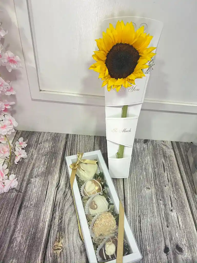 Un hermoso solitario de encanto con girasol, ideal para alegrar cualquier espacio. Acompañado de una caja de chocolate rellena con fresas cubiertas de chocolate, este combo es perfecto para regalar en ocasiones especiales o simplemente para disfrutar. La combinación de la flor vibrante y el dulce sabor del chocolate crea un detalle encantador y memorable.
