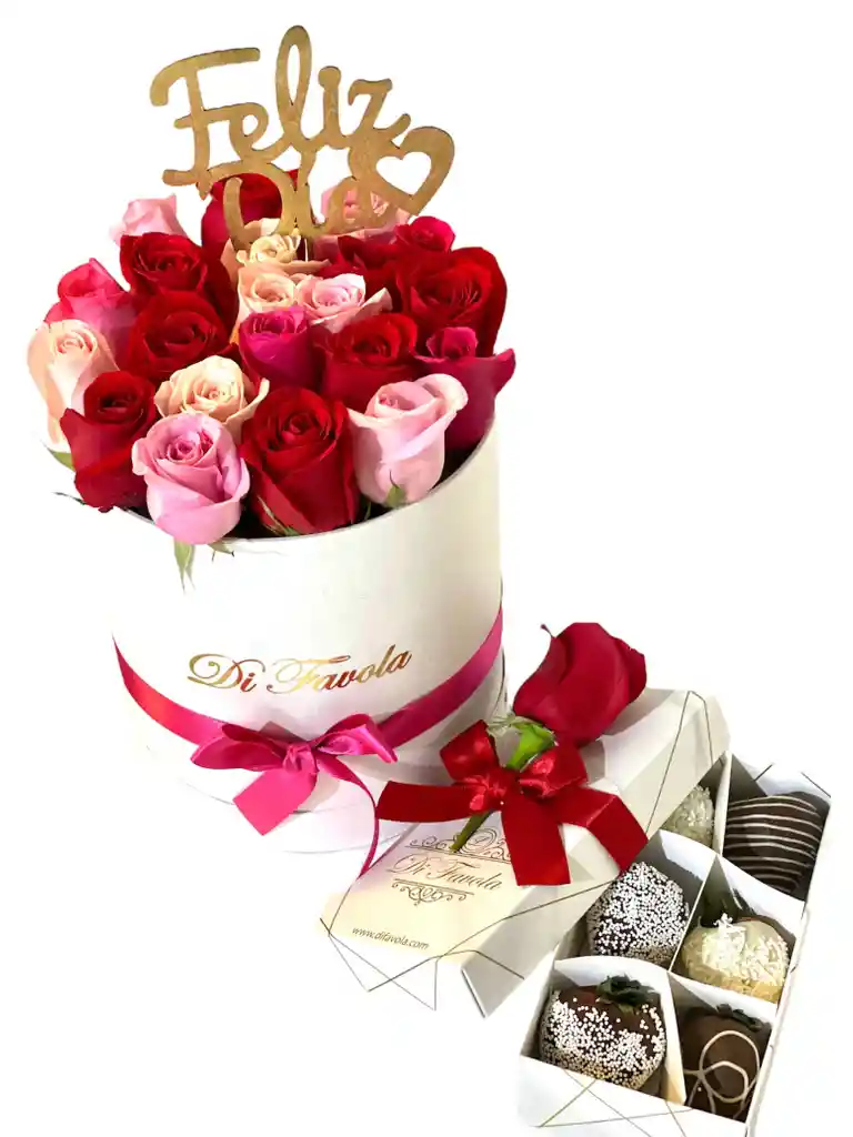 cilindro blanco de rosas colores surtidos, y topper de feliz dia + caja x 6 fresas achocolatadas y toppings envíanos mensaje para la tarjeta