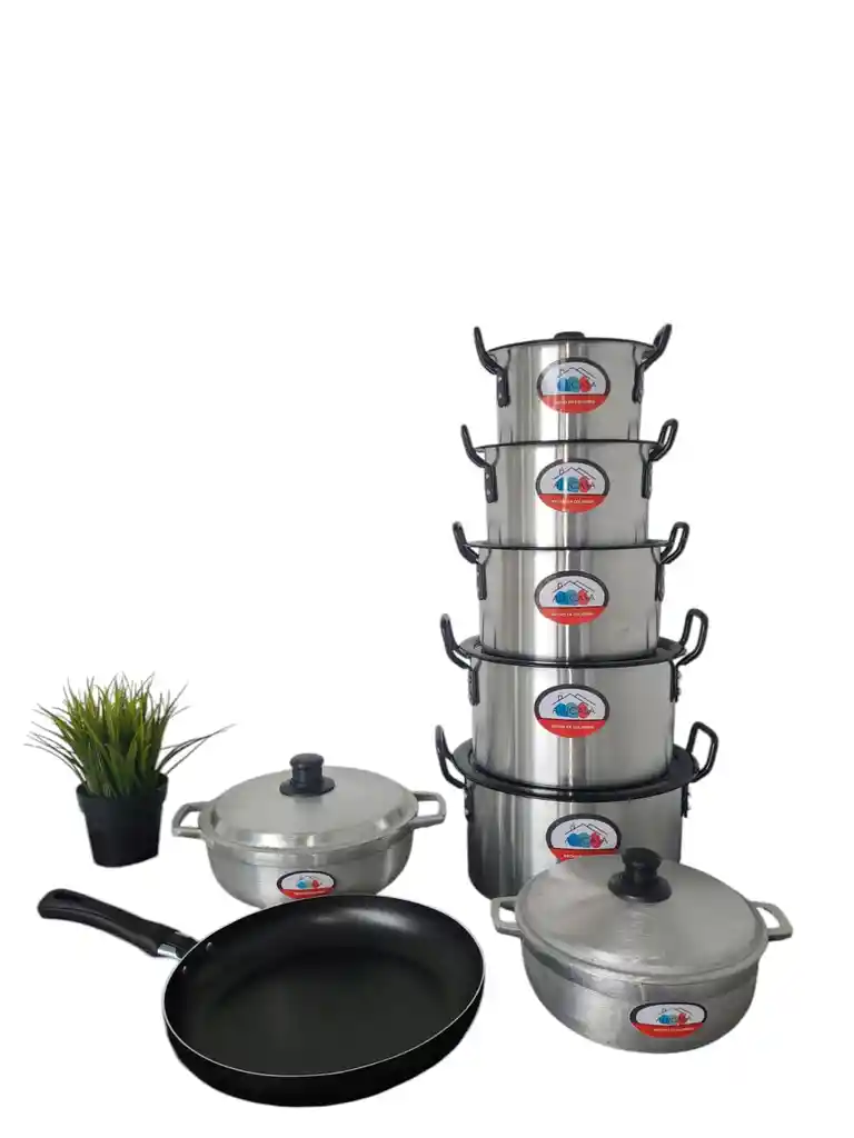 Olla 14-22 tapa negra en Aluminio Olla 14cm 1litro Olla 16cm 1.5 litros Olla 18cm 2 litros Olla 20cm 3 litros Olla 22cm 4 litros Caldero #1 17cm 100gr Caldero #4 22cm 500gr Sarten Antiadherente 24cm Lavar bien antes de usar