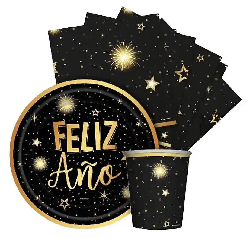 Se envia un Juego de Plato Vaso y Servilleta Feliz Año Negro Dorado Sempertex Incluye: 1 paquete de platos x 8 unidades de 7 pulgadas - 18 cm 1 paquete de vasos x 8 unidades 9 onzas 1 paquete x 16 servilletas