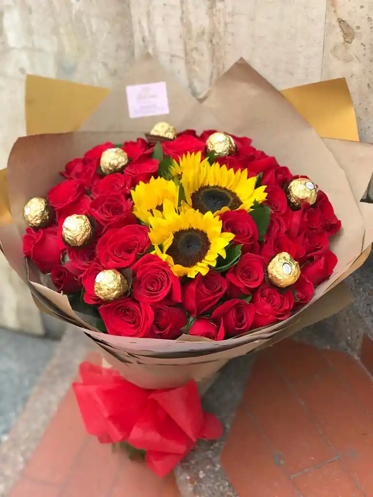 El regalo más completo y especial de nuestra colección 💝. Un bouquet de 300 rosas rojas 🌹 con 10 girasoles en el centro 🌻, acompañado de 24 chocolates Ferrero Rocher 🍫 y 3 globos en helio 🎈. Un detalle pensado para celebrar en grande y sorprender con elegancia. 📌 Precio: