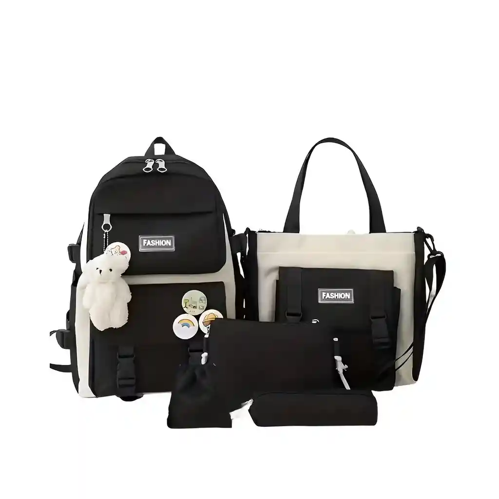 ¡Prepárate para el regreso a clases con el estilo más trendy! Este espectacular set de 5 piezas es perfecto para quienes buscan organización, comodidad y un diseño "Aesthetic" único. Fabricado en lona de alta resistencia, este combo no solo incluye un amplio morral principal con compartimento para laptop, sino que viene acompañado de un bolso tipo Tote, un bolso manos libres (crossbody), una cartuchera y una tula pequeña para accesorios. Sus detalles de correas ajustables, bolsillos estratégicos y parches decorativos lo convierten en el aliado ideal para el colegio, la universidad o el uso diario. Un kit completo que combina funcionalidad moderna con una estética juvenil y sofisticada. //// El bolso incluye dos botones para decorar el bolso , no incluye el peluche de llavero //// Características principales: Kit Completo de 5 Piezas: Incluye Morral Principal, Bolso de hombro (Tote), Bolso manos libres pequeño, Cartuchera y Tula con cordón. Diseño Inteligente: El morral principal cuenta con múltiples compartimentos internos para organizar libros, cuadernos y dispositivos electrónicos. Material Resistente: Fabricado en tela Oxford/Poliéster de alta calidad, duradera y fácil de mantener. Estilo Personalizable: Incluye pines decorativos frontales que realzan su diseño juvenil. Máxima Versatilidad: Ideal para estudiantes de todas las edades, oficina o como equipaje de mano. Ficha Técnica: Producto: Set de Morrales Escolares Material: Lona Oxford / Poliéster Piezas incluidas: 5 unidades Medidas Morral: 43 cm alto x 30 cm ancho x 13 cm profundidad Cierre: Cremalleras reforzadas y herrajes plásticos de alta densidad Género: Juvenil / Unisex Referencia: B330 / B228 Políticas de Garantía: Este producto cuenta con una garantía de 30 días calendario que cubre exclusivamente defectos de fabricación (costuras sueltas, fallos en cremalleras o hebillas rotas al momento de la entrega). La garantía no será válida si el producto presenta señales de mal uso, sobrecarga excesiva de peso, cortes accidentales o evidencia de haber sido modificado. Para tramitar cualquier reclamación, es indispensable presentar el producto con todas sus 5 piezas y en buen estado de limpieza.