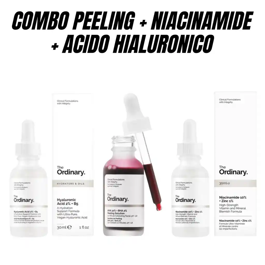 El set de Niacinamida 10% 30 ml + Ácido Hialurónico 2% 30 ml + Peeling Solution 30 ml de The Ordinary es una combinación de productos diseñados para mejorar la apariencia de la piel y abordar problemas comunes como la hiperpigmentación, las líneas finas y la textura desigual. Puedes consultar el modo de uso en la pestaña "Guía The Ordinary" donde podras seguir el paso a paso de tu rutina facial. Beneficios: - Mejora la textura de la piel: La Niacinamida 10% ayuda a reducir la aparición de poros dilatados y a mejorar la textura de la piel. - Hidratación profunda: El Ácido Hialurónico 2% proporciona hidratación profunda y duradera a la piel, lo que ayuda a mantenerla suave y radiante. - Exfoliación química: El Peeling Solution contiene una mezcla de ácidos alfa-hidroxiácidos (AHA) y beta-hidroxiácidos (BHA) que ayudan a exfoliar la piel y a mejorar su textura y apariencia. - Reducción de la hiperpigmentación: La Niacinamida 10% y el Peeling Solution pueden ayudar a reducir la aparición de manchas oscuras y hiperpigmentación. Características: - Fórmulas avanzadas: Los productos contienen ingredientes activos en concentraciones efectivas para abordar problemas específicos de la piel. - Texturas ligeras: Las fórmulas son ligeras y se absorben rápidamente en la piel, lo que las hace ideales para uso diario. - Adecuados para todo tipo de piel: Los productos son adecuados para pieles sensibles y no comedogénicos, lo que significa que no obstruyen los poros. Opiniones de los usuarios: - Muchos usuarios han reportado resultados positivos, como una piel más suave y radiante, y una reducción en la aparición de poros dilatados y manchas oscuras.
