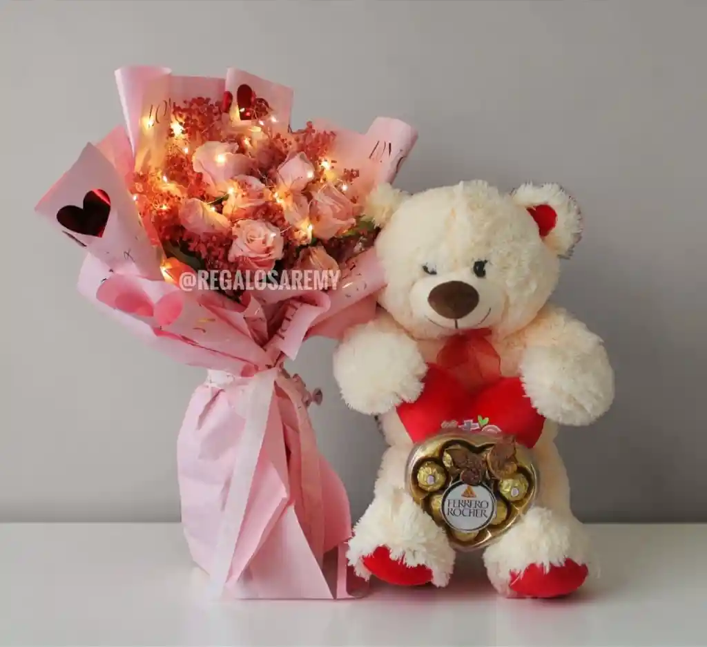 Combo especial que incluye: 💕 Peluche de 65 cm 💕 Ramo de rosas rosadas con luces LED 💕 Caja de chocolates Ferrero Rocher en presentación especial en forma de corazón. 💕Incluye bolsa de regalo. Un regalo completo, elegante y perfecto para sorprender