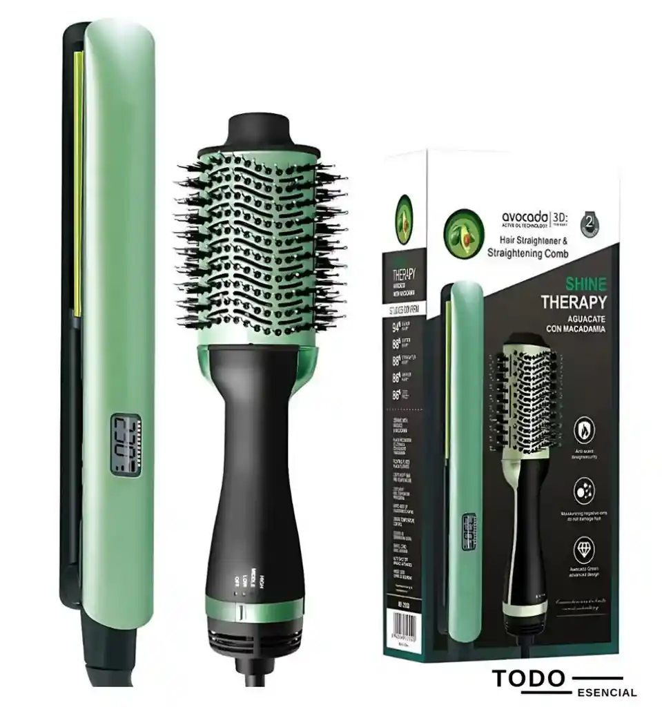 Transforma tu rutina de belleza con el Combo Plancha y Cepillo Secador, diseñado para brindarte un alisado perfecto y un secado eficiente, mientras cuidas tu cabello con los beneficios del aceite de aguacate. 🌿 Plancha de Pelo con Aguacate Esta plancha combina tecnología de placas cerámicas con el poder nutritivo del aceite de aguacate, aportando hidratación y brillo a tu cabello mientras lo alisas. Alcanza una temperatura máxima de 450°C, permitiendo un alisado rápido y duradero. Con su diseño ergonómico y liviano, su cable giratorio de 360° y su tiempo de calentamiento de solo 80 segundos, es la herramienta ideal para un peinado profesional en casa. 💨 Cepillo Secador 2 en 1 Un secado y peinado en un solo paso. Gracias a sus 3 niveles de flujo de aire y 2 niveles de temperatura, este cepillo secador permite un secado rápido mientras alisa y da volumen. Sus cerdas de nylon y cerámica ayudan a desenredar y distribuir el calor de manera uniforme para un acabado suave y sedoso. Además, su tratamiento de aguacate cuida la fibra capilar, evitando el daño por calor. Ficha Técnica: ✔ Plancha con recubrimiento cerámico para un alisado uniforme. ✔ Cepillo secador con tecnología 2 en 1 que seca y alisa en un solo paso. ✔ Temperatura ajustable para adaptarse a tu tipo de cabello. ✔ Cables giratorios de 360° de 1.70 m para mayor comodidad. ✔ Diseño ergonómico y liviano, ideal para el uso diario. Si buscas practicidad, cuidado y resultados profesionales, el Combo Plancha y Cepillo Secador con Aguacate es la opción perfecta para ti. ¡Luce un cabello suave, brillante y saludable todos los días! ✨