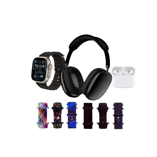 Combo tecnológico ideal para el uso diario, que incluye audífonos inalámbricos, diadema compatible con iPhone y reloj inteligente. Perfecto para quienes buscan funcionalidad, estilo y practicidad en un solo paquete.