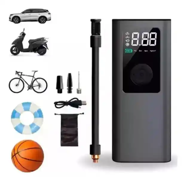 Presión máxima: 150 PSI / 10 BAR. Capacidad de la batería: 2000 mAh. Función de banco de energía (power bank). Luz LED integrada con modos de luz blanca, flash y SOS. Medición de presión precisa. Presión máxima de inflado: 150 PSI / 10 BAR. Batería: Cuenta con una batería de litio de 2000 mAh. Funciones adicionales: Luz LED de 0.5W integrada. Función de Power Bank. Medición precisa de la presión. Potencia y voltaje: 200W de potencia y 12V de voltaje. Carga: Tiempo de carga: 2 - 2.5 horas. Entrada de carga: 5V/2A. Portabilidad: Diseño portátil y compacto. Uso: Adecuado para inflar neumáticos de bicicletas, automóviles, motocicletas, pelotas y otros objetos inflables.