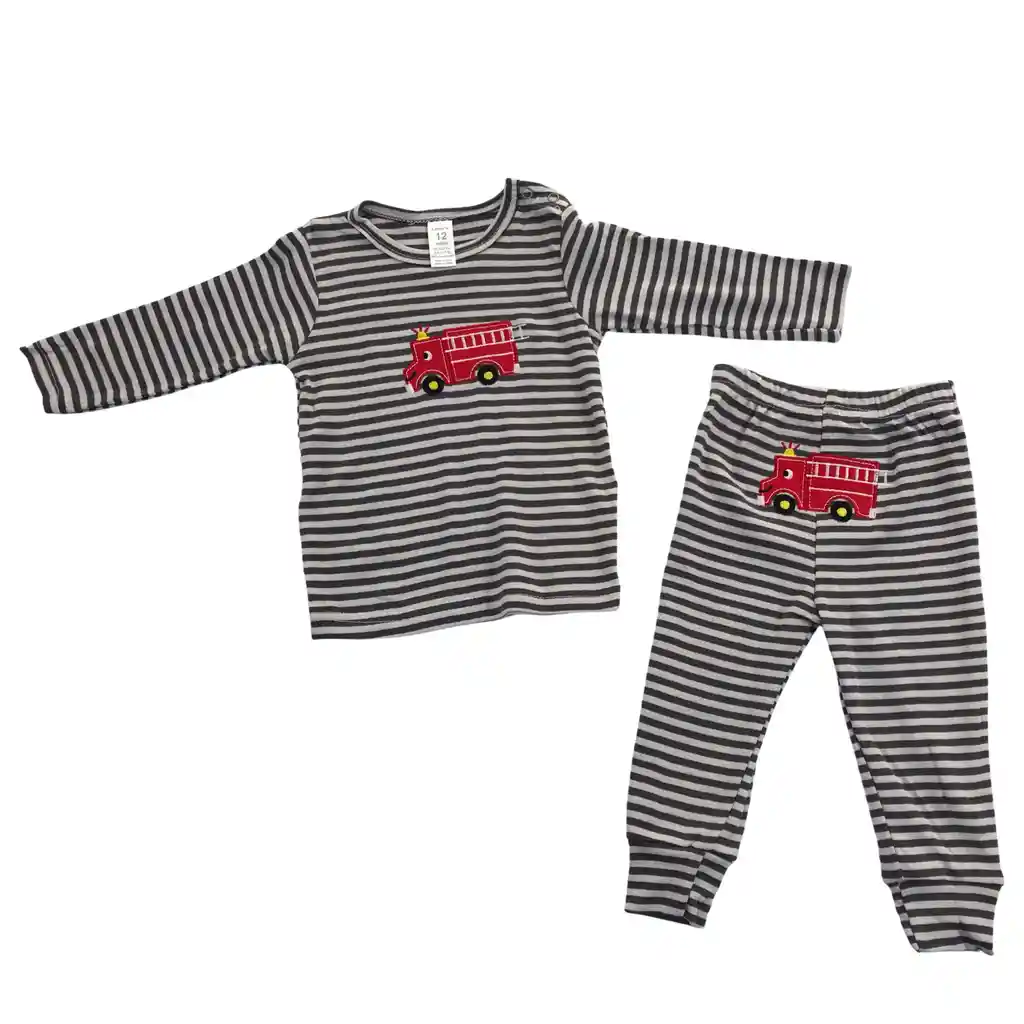 Conjunto para bebé de 9 a 12 meses, compuesto por camiseta de manga larga y pantalón a juego. Diseño a rayas en tonos grises con adorable bordado de carro de bombero que le da un toque divertido y tierno. Tela suave y cómoda, ideal para el uso diario, permitir libertad de movimiento y mantener al bebé abrigado sin incomodidad. Perfecto para salidas, descanso o como regalo especial.