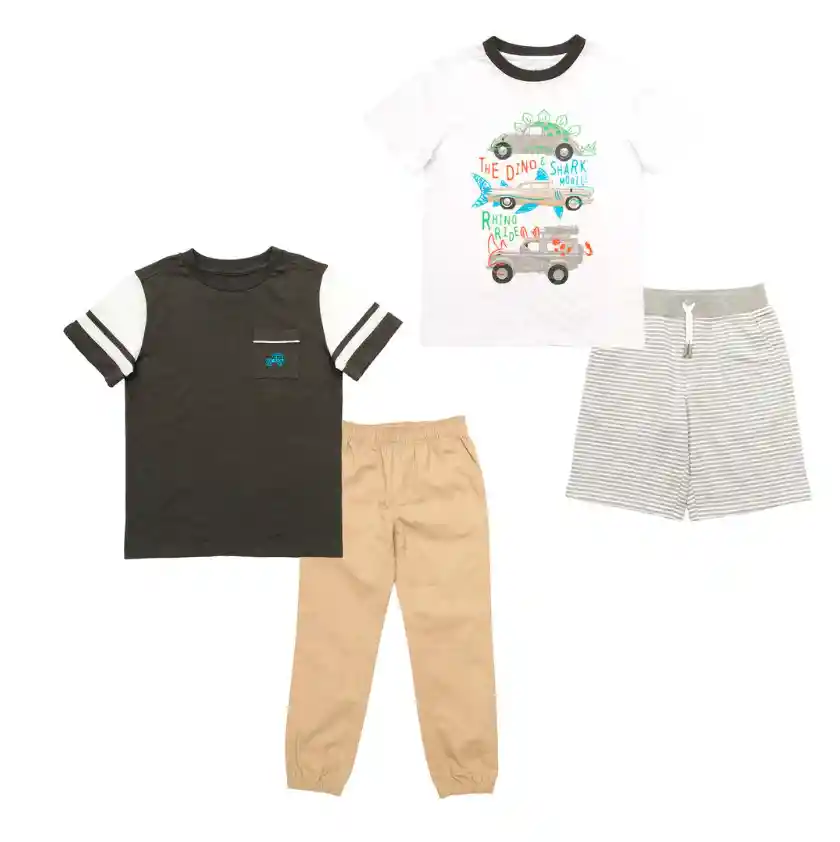 Este conjunto de 4 piezas de Kids Headquarters ofrece la combinación perfecta de comodidad, frescura y estilo para acompañar a tu pequeño en cualquier actividad del día. Incluye dos camisetas de manga corta con diseños llamativos y colores vibrantes, ideales para crear atuendos divertidos y llenos de personalidad. Además, incorpora un pantalón largo y un pantalón corto que permiten adaptarse fácilmente al clima, garantizando libertad de movimiento y suavidad en cada paso. Su fabricación con materiales resistentes y agradables al tacto asegura durabilidad y confort, convirtiéndolo en un set versátil para jugar, pasear o disfrutar de momentos en familia. Información del producto Confección en materiales transpirables | Camisetas ligeras de manga corta | Pantalón largo para mayor cobertura | Shorts para días cálidos | Cintura flexible | Materiales: algodón, poliéster y elastano | Cuidados de lavado: voltea la prenda al revés. Lava a máquina con agua fría con colores similares en ciclo delicado. Usa solamente blanqueador sin cloro cuando sea necesario. Seca en secadora a temperatura baja. Plancha en frío el reverso si es necesario