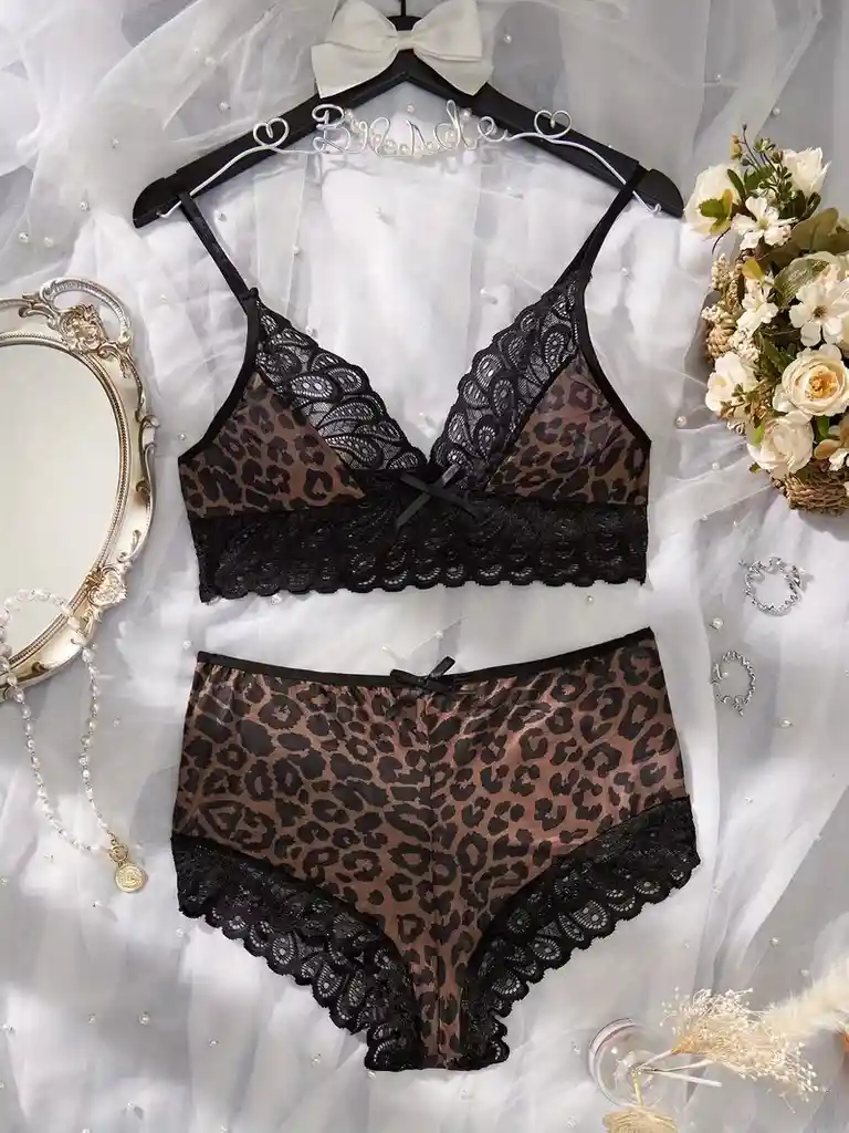 Conjunto de lencería sexy bordada de malla transparente con diseño