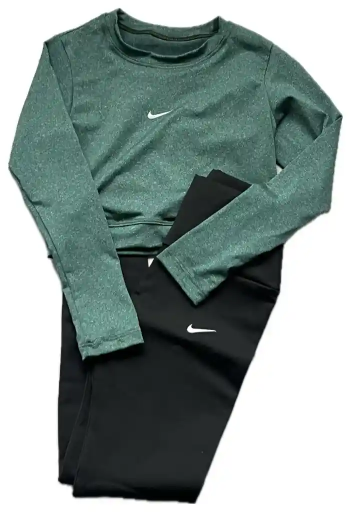 Conjunto deportivo de licra negra y buzo verde, talla única, material suplex deportivo.