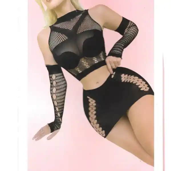 Conjunto en malla. Con falda, top y guantes. Ideal para tus noches románticas.