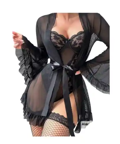 Set de Lencería con Bata – Encaje Floral & Malla Transparente ✨ ¡Un look que combina misterio, glamour y seducción! 💋 Este conjunto incluye: 👗 Body de encaje negro con diseño floral, escote profundo y ajuste perfecto 🖤 Bata de malla transparente con bordes rizados y mangas acampanadas 🎀 Cinturón de satén para amarre en la cintura 🧦 Medias tipo red con liga alta en encaje Ideal para sesiones fotográficas, noches especiales o colecciones visuales con estilo. Su mezcla de texturas y transparencias crea un efecto impactante y sofisticado. 💪 Material cómodo y ligero 🌹 Detalles que realzan la silueta 📸 Perfecto para contenido visual, regalos o vitrinas temáticas