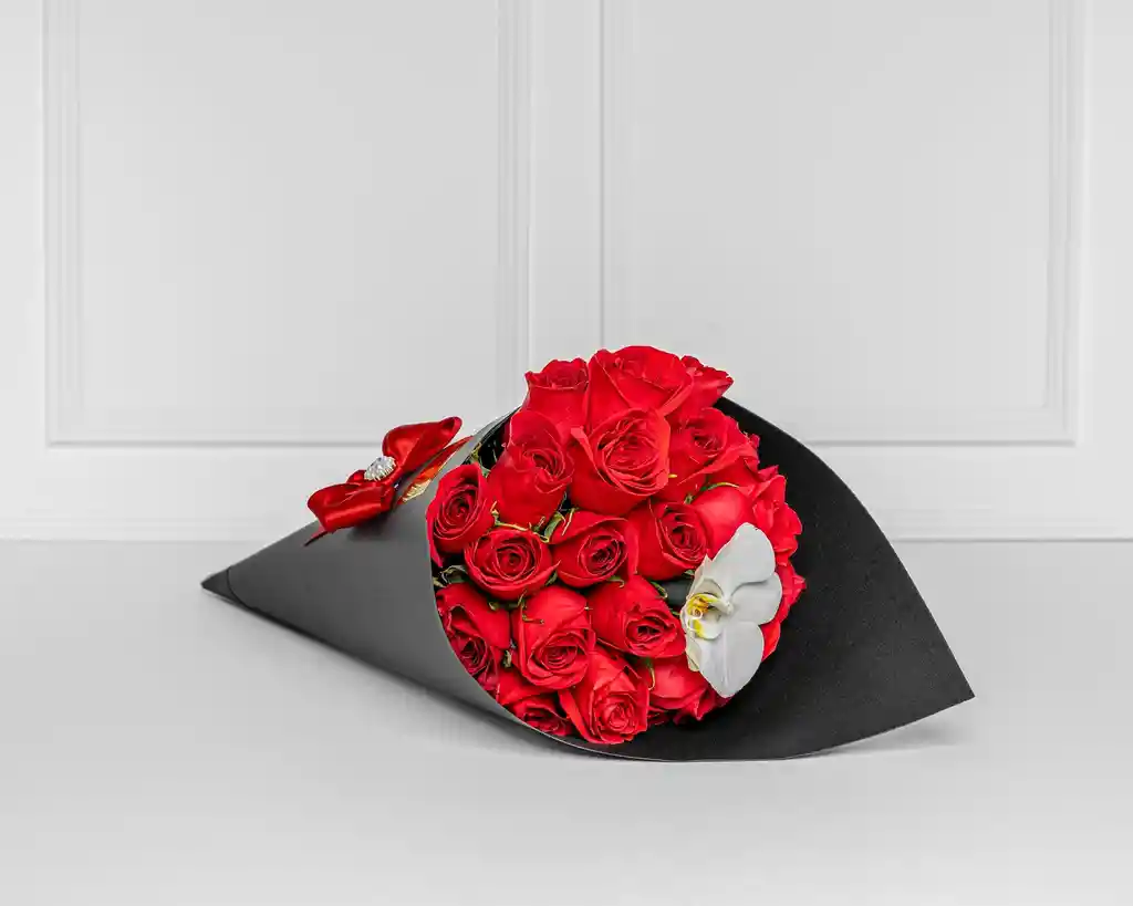 Hermoso cono negro de lujo con rosas rojas con detalle de orquídea blanca, un regalo elegante y sofisticado. Incluye tarjeta con mensaje personalizado y cuidados del arreglo floral.