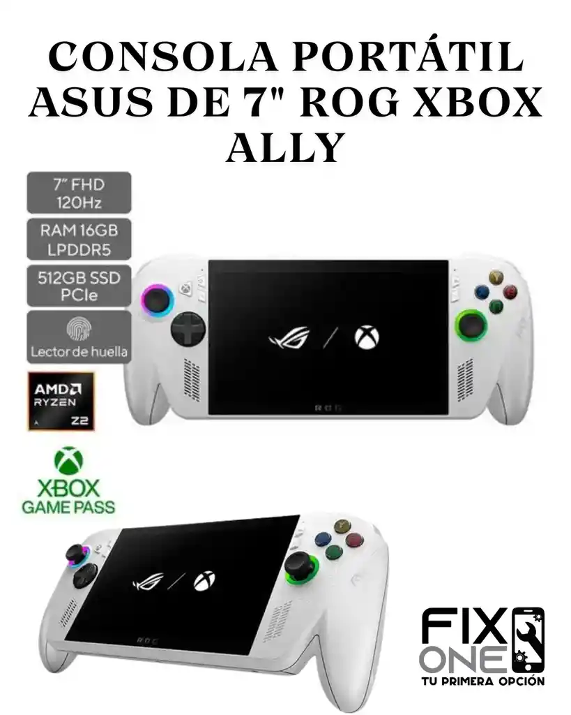 Consola portátil Asus de 7" ROG Xbox Ally Características: • Pantalla: 7" FHD (120 Hz) • Batería: 3 celdas 60 WH • Duración de la batería: hasta 5.4 horas • Procesador: AMD Ryzen Z2A, 2.8 GHz • Memoria integrada: 16 GB • Almacenamiento: 512 GB SSD • Sensor huellas dactilares integrado • Sistema operativo: Windows 11 • Teclado táctil • Iluminación RGB • Refrigeración inteligente ROG • Incluye 3 meses de Xbox Game Pass gratis • Dimensiones: 5.4 x 28.5 x 13 cm • Peso: 611 gramos ⭕La ROG Xbox Ally es el dispositivo Gamer portátil con Windows definitivo, con el doble de capacidad de batería y almacenamiento que la ROG Xbox Ally original, además de más RAM y controles mejorados. Con una nueva versión de Armory Crate SE con una biblioteca de juegos aún más personalizable, la ROG Xbox Ally fue creada con los comentarios de la comunidad en mente para ser tu computadora de mano perfecta. Juega todos tus juegos, dondequiera que vayas. ⭕JUEGA SIN INTERRUPCIONES Equipado con el procesador ultraeficiente AMD Ryzen Z2, el ROG Xbox Ally ofrece un rendimiento de nivel consola y puede jugar durante horas, incluso sin conexión a una toma de corriente ⭕Almacenamiento listo para juegos y memoria rápida Almacena tu biblioteca completa y multitarea sin problemas con SSD de 512 GB y 16 GB de RAM LPDDR5 de 6400 MHz. El ROG Xbox Ally hace posible jugar cualquier juego en la palma de tu mano. ⭕3 MESES DE XBOX GAME PASS PREMIUM INCLUIDOS Juega más de 200 juegos en el ROG Xbox Ally. * Es lo mejor de ROG y Xbox juntos en una consola portátil construida para juegos de PC. *Se aplican términos ⭕LISTO PARA USAR CON CARGA RÁPIDA El ROG Xbox Ally carga súper rápido: solo 30 minutos te llevan del 0% al 50%. Ya sea que juegues en el sofá, en una cafetería o a 30,000 pies de altura, su tecnología de carga rápida y batería de 60Whrs te mantienen conectado durante más tiempo en el juego. ⭕Juega de la manera que quieras Juega en cualquier lugar en modo portátil o conéctalo a tu televisor con los prácticos puertos USB tipo C duales. Conecta varios controladores para jugar con amigos. Nunca tendrás que conformarte con el ROG Xbox Ally.