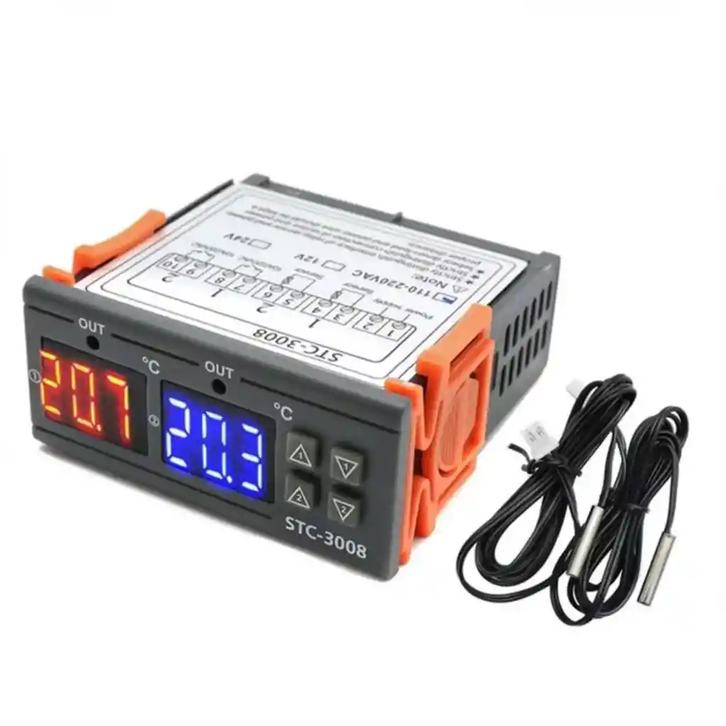 Controlador Digital de Temperatura Dual STC-3008 con 2 Relés 110/220V El STC-3008 es un controlador digital de temperatura de doble canal, diseñado para controlar calefacción y refrigeración de forma independiente o simultánea. Incorpora dos relés de salida, alta precisión, memoria ante cortes de energía y sensores NTC impermeables, lo que lo hace ideal para aplicaciones industriales, agrícolas y domésticas. Permite configurar 1 calefacción + 1 refrigeración, 2 calefacciones o 2 refrigeraciones, adaptándose a múltiples escenarios de control térmico. Producto disponible para entrega inmediata. Aplicaciones Cámaras de refrigeración y congelación Incubadoras y criaderos Invernaderos Acuarios y peceras Equipos de calefacción y refrigeración Control térmico en granjas y procesos industriales Uso doméstico y técnico Características principales Control dual de temperatura (dos canales independientes) Dos salidas por relé para calefacción y/o refrigeración Cambio automático entre modo calor y frío Resolución de lectura 0,1 °C Alta precisión y estabilidad Memoria interna (conserva parámetros tras cortes de energía) Corrección de temperatura configurable Alarmas de alta y baja temperatura Sensores NTC impermeables incluidos Pantalla digital clara y fácil de operar Funciones de configuración Restauración de fábrica: Presionar Down 1 + Down 2 simultáneamente Corrección de temperatura: mantener Up 1 + Down 1 por 3 segundos Modos configurables: 1 calefacción + 1 refrigeración 2 calefacciones 2 refrigeraciones Parámetros avanzados: P0 / P1: Retardo de arranque (0–60 min) P2: Alarma de alta temperatura (hasta 120 °C) P3: Alarma de baja temperatura (hasta -55 °C) Especificaciones técnicas Modelo: STC-3008 Tipo de display: Digital Sensor: NTC 10K Longitud del sensor: 1 m Rango de medición y control: -55 °C a +120 °C Resolución: 0,1 °C Precisión: ±1 °C Alimentación: 110–220 VAC ±10% (50/60 Hz) Consumo: 3 W Capacidad de relé: Calefacción: 10A / 240VAC Refrigeración: 10A / 240VAC Material de la carcasa: ABS retardante a la llama Dimensiones del equipo: 75 × 85 × 35 mm Contenido del paquete 1 Controlador digital de temperatura STC-3008 2 Sensores NTC impermeables (1 m cada uno)