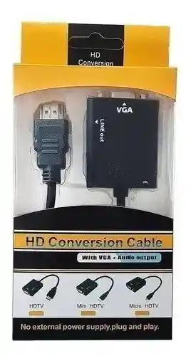 Convertidor Vga a Hdmi *Largo del cable: 10 cm. *Unidades por pack: 1. *Formato de venta: Unidad. *Con entrada HDMI y salida VGA. *El material de revestimiento del conector es latón niquelado. *Resolución máxima de 1080p. *Compatible con dvd, notebook, pc, receptores sky, tv box, videogames.