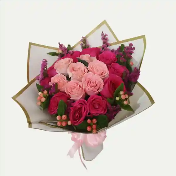 Ramillete con 10 rosas fucsias y 7 rosas rosadas, variedad de follaje, papel coreano y lazo. Coral de rosas no nace del instante, sino de lo que permanece. De vínculos que crecen sin prisa, se adaptan al tiempo y encuentran belleza en quedarse. Rosas que guardan cercanía y memoria, afectos que no se anuncian, pero sostienen. Como el coral, vive porque se construye junto a otros y porque resiste, aun siendo delicado.