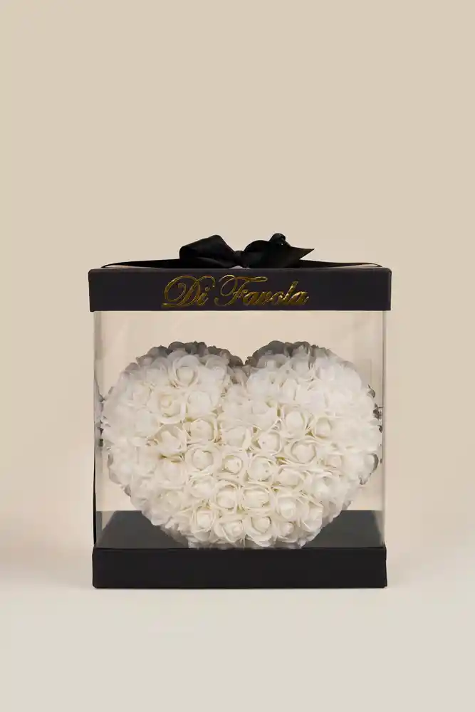 Hermoso corazón de rosas hechas 100% a mano artificiales en caja de acetato color: blanco duración eterna.