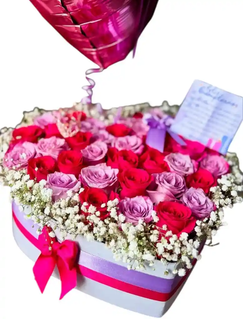 CAJA DE CORAZON CON ROSAS LILA Y FUCSIA, PERLA , DOS GLOBOS EN HELIO ETALIZADOS , MOÑO , TARJETA PERSONALIZADA