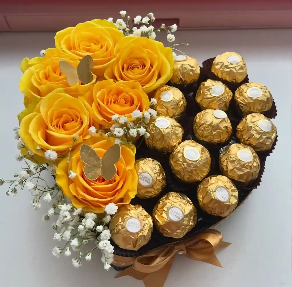 Corazon de rosas amarillas mas chocolates ferreros y mariposas
