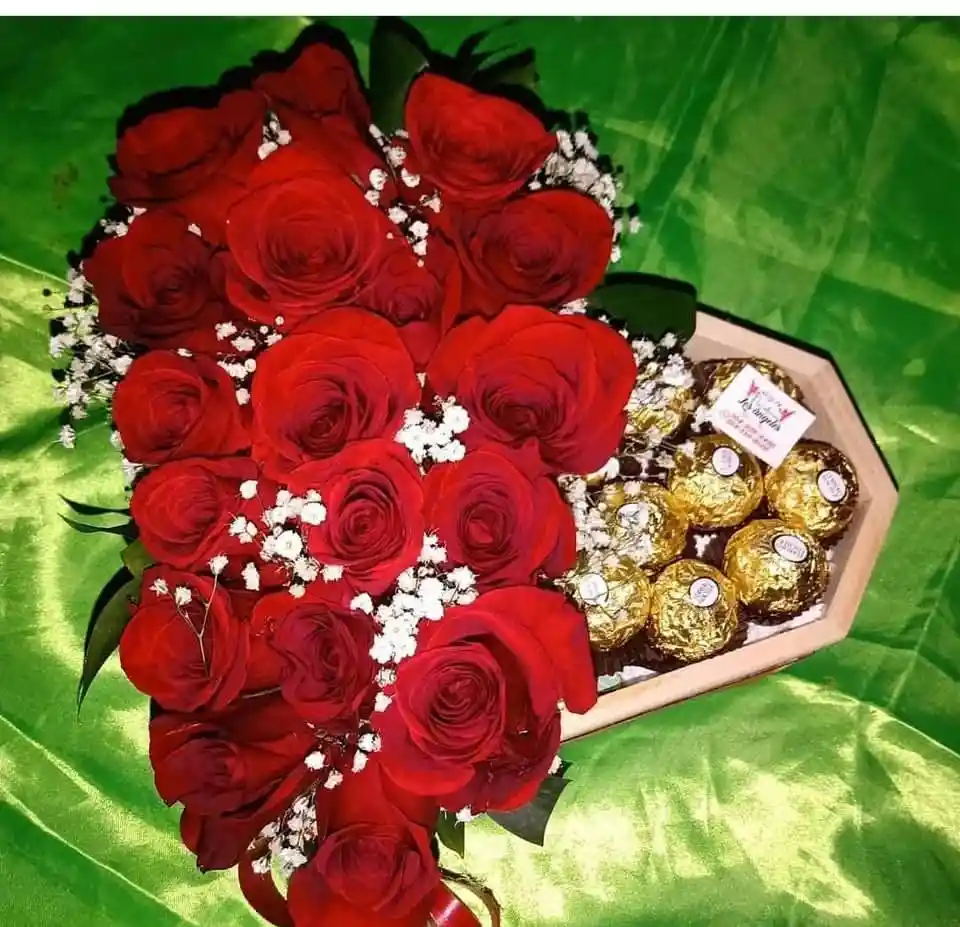 CORAZON CON ROSAS Y CHOCOLATES, OPCION CON VINO Y COPAS