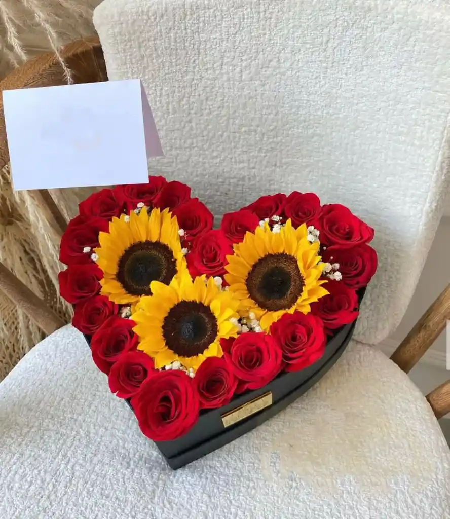 Hermoso corazón con rosas y tres girasoles y un toque de gypso.