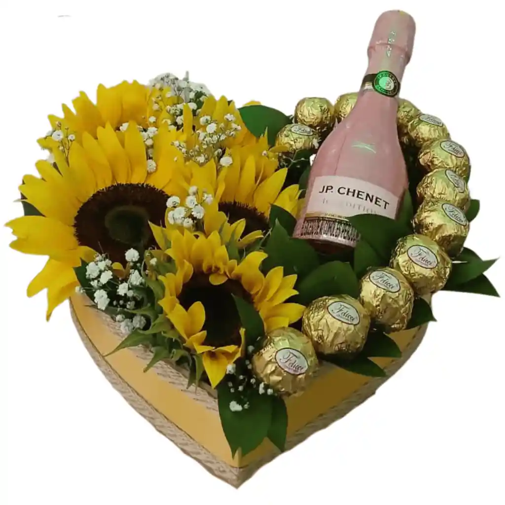 Hermoso arreglo floral en caja corazón de madera, con girasoles, champagne JP Chanet x200 ml y bombones de chocolates línea nacional. Perfecto para toda ocasión.