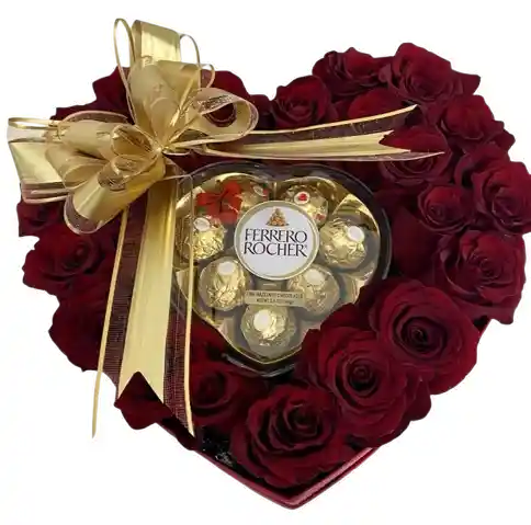 Elegante caja en forma de corazón con rosas rojas frescas y chocolates Ferrero Rocher. El regalo perfecto para expresar amor, lujo y dulzura en un solo detalle.